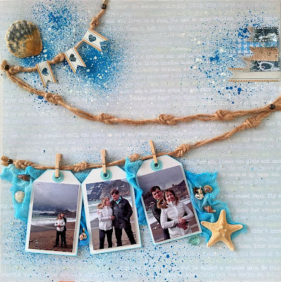 Я использовала достаточно яркий лист бумаги, поэтому прошлась белым акрилом на месте под фотографиями (вы можете использовать кальку или кусочки скрапбумаги), а потом поставила кляксы красками двух цветов, постукивая кисточкой по пальцу (Если оформление страницы не предполагает использование подложки и краски, то можно этот этап пропустить). Идем дальше. В левом нижнем углу страницы располагаем теги с фотографиями, приподнимая их над листом на объемные клеевые квадратики. В правом верхнем углу наклеиваем, слегка накладывая один на другой, длинные флажки, украшенные жидким жемчугом. Располагаем веревочки на странице согласно скетчу (если веревочки уж совсем не подходят по сюжету к фотографиям, то можно от них отказаться), соединяем теги с нижней веревочкой скрепками/ прищепками/ зажимами. На верхней веревочке размещаем флажки, наклеив их на объемные клеевые квадратики. Украшаем работу, добавив высечки и брадсы. Авантюра подошла к концу. Огромное всем спасибо за участие.