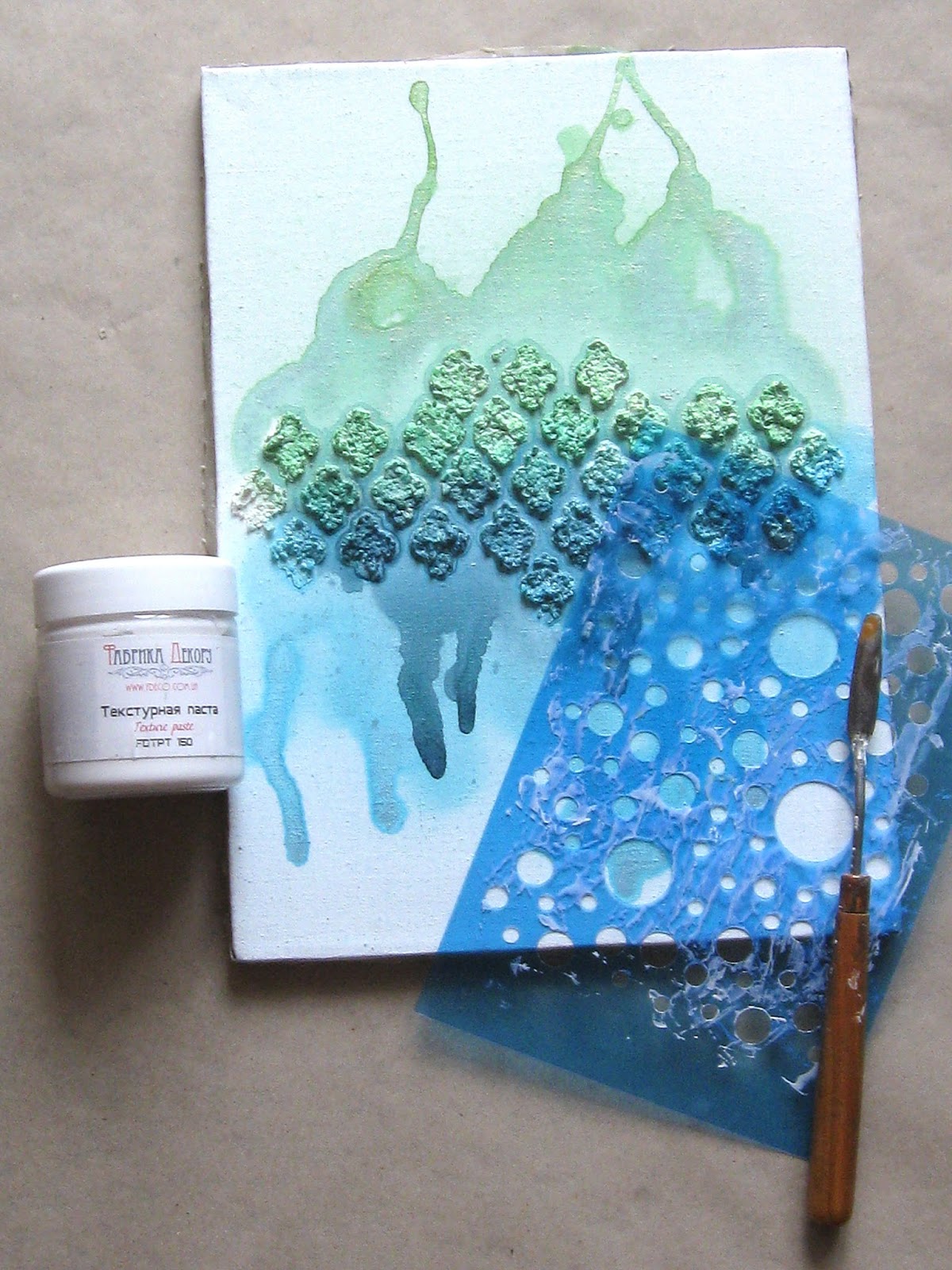 Теперь добавляю фактуру холсту при помощи гладкой текстурной пасты и маски от Фабрики декора